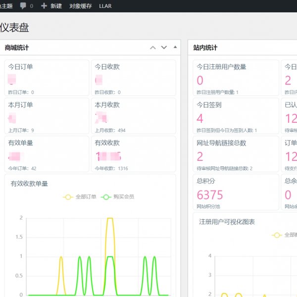 有效订单只统计非余额支付和非积分支付的订单。 可统计每日收款单量和金额,每日注册用户数量、评论数量、签到数量。认证用户数量,网址导航链接总数等。 仪表盘点击选项,只显示两种图表。