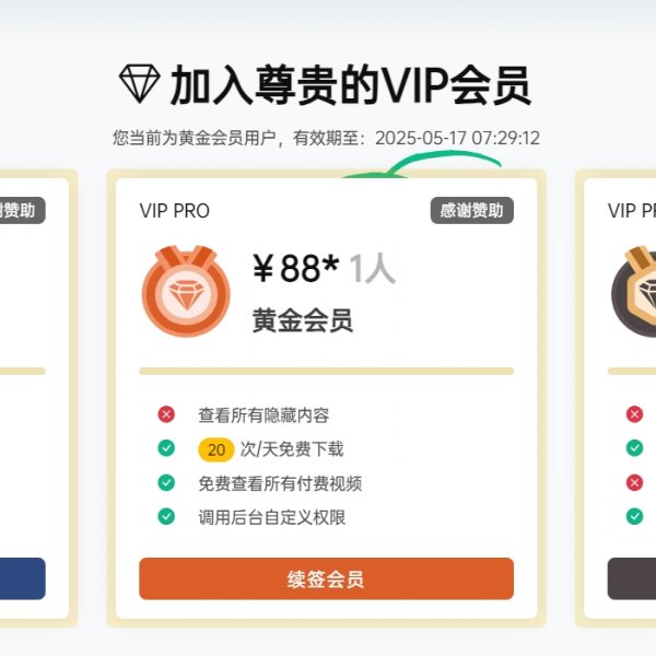 可以生成各等级的会员卡从而进行贩卖赠送,比卡密更方便,更实用 用法举例:可以使用插件生成几张短期会员卡随机发放群里给用户体验,能充分带动用户热情并且提高会员转化率 插件特点 可以省去卡密充值余额然后再进行购买vip等繁琐操作,方便用户 可以充值时附赠一定的余额或者积分 插件已接入主题订单系统,购买完成后会生成相应订单,方便记录 插件交互使用token,与主题一致,完美兼容 插件支持生成不同vip等…